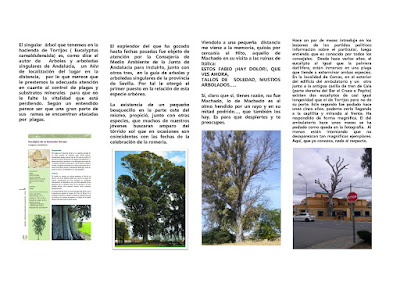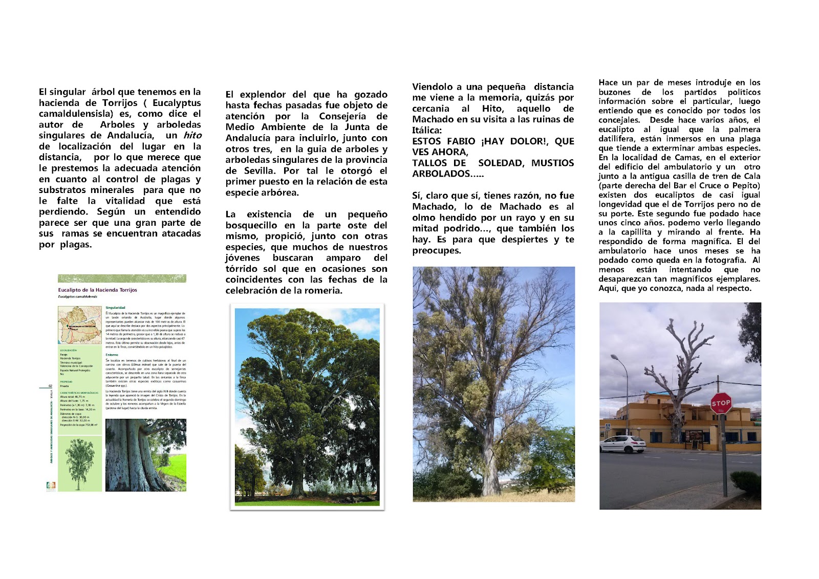 El singular árbol que tenemos en la hacienda de Torrijos ( Eucalyptus camaldulensisla) es, como dice el autor de Arboles y arboledas singulares de Andalucía, un hito de localización del lugar en la distancia, por lo que merece que le prestemos la adecuada atención en cuanto al control de plagas y substratos minerales para que no le falte la vitalidad que está perdiendo. Según un entendido parece ser que una gran parte de sus ramas se encuentran atacadas por plagas.